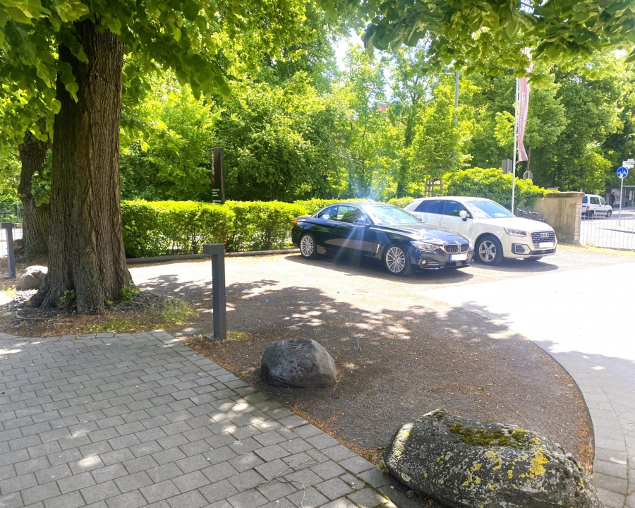 Ein Parkplatz befindet sich direkt vor dem Gebäude.